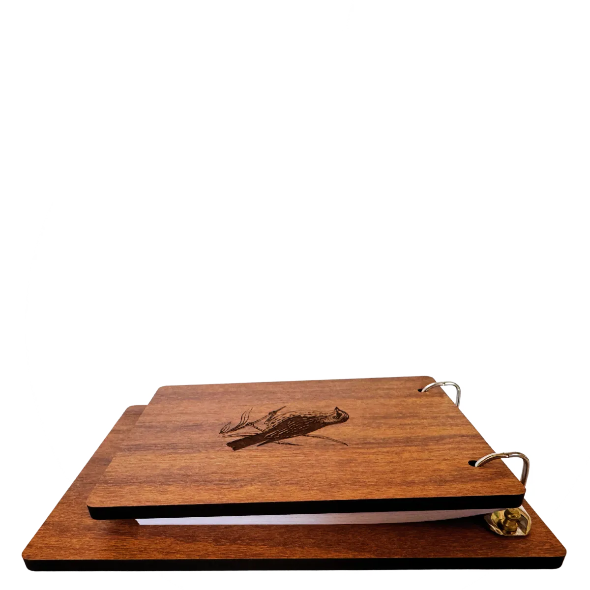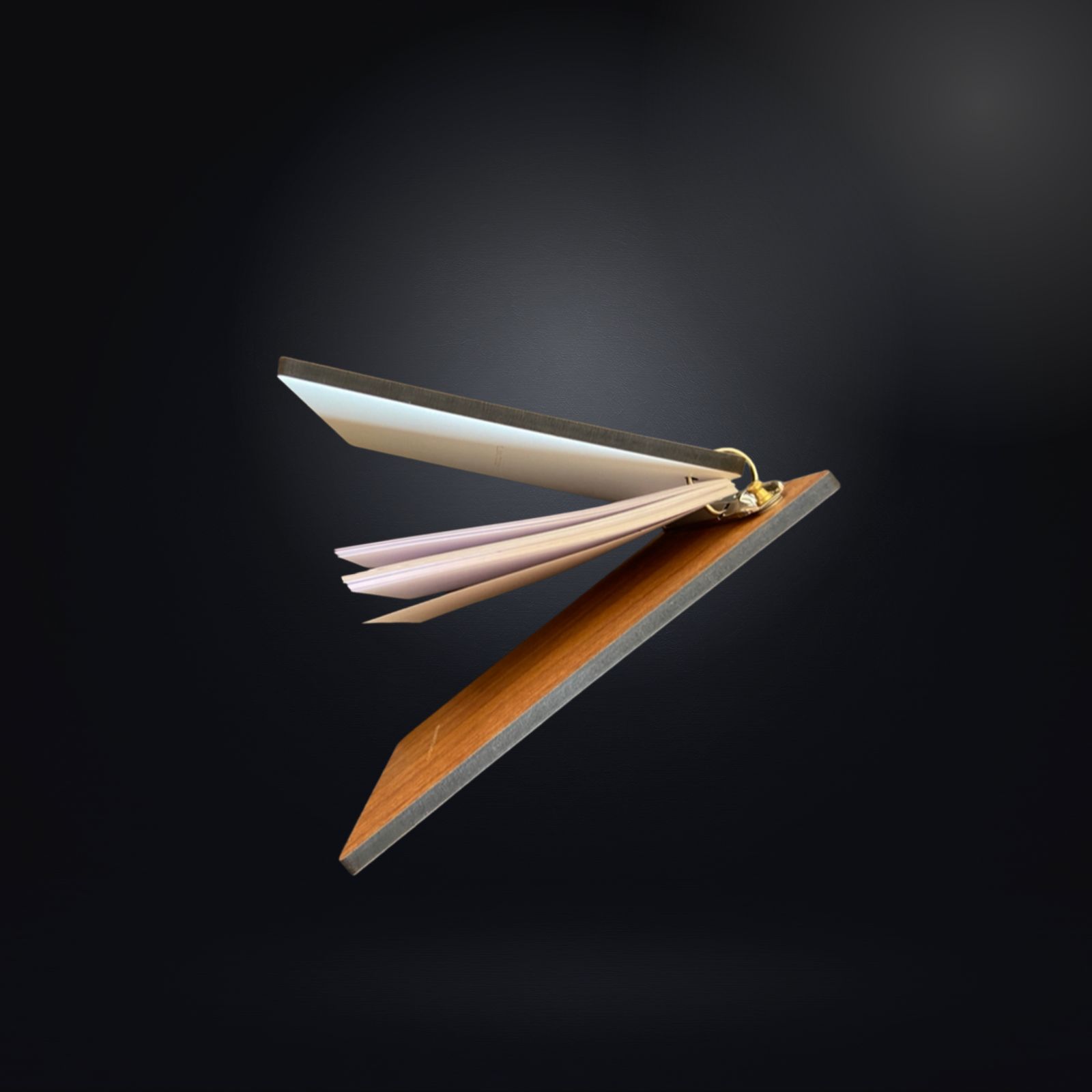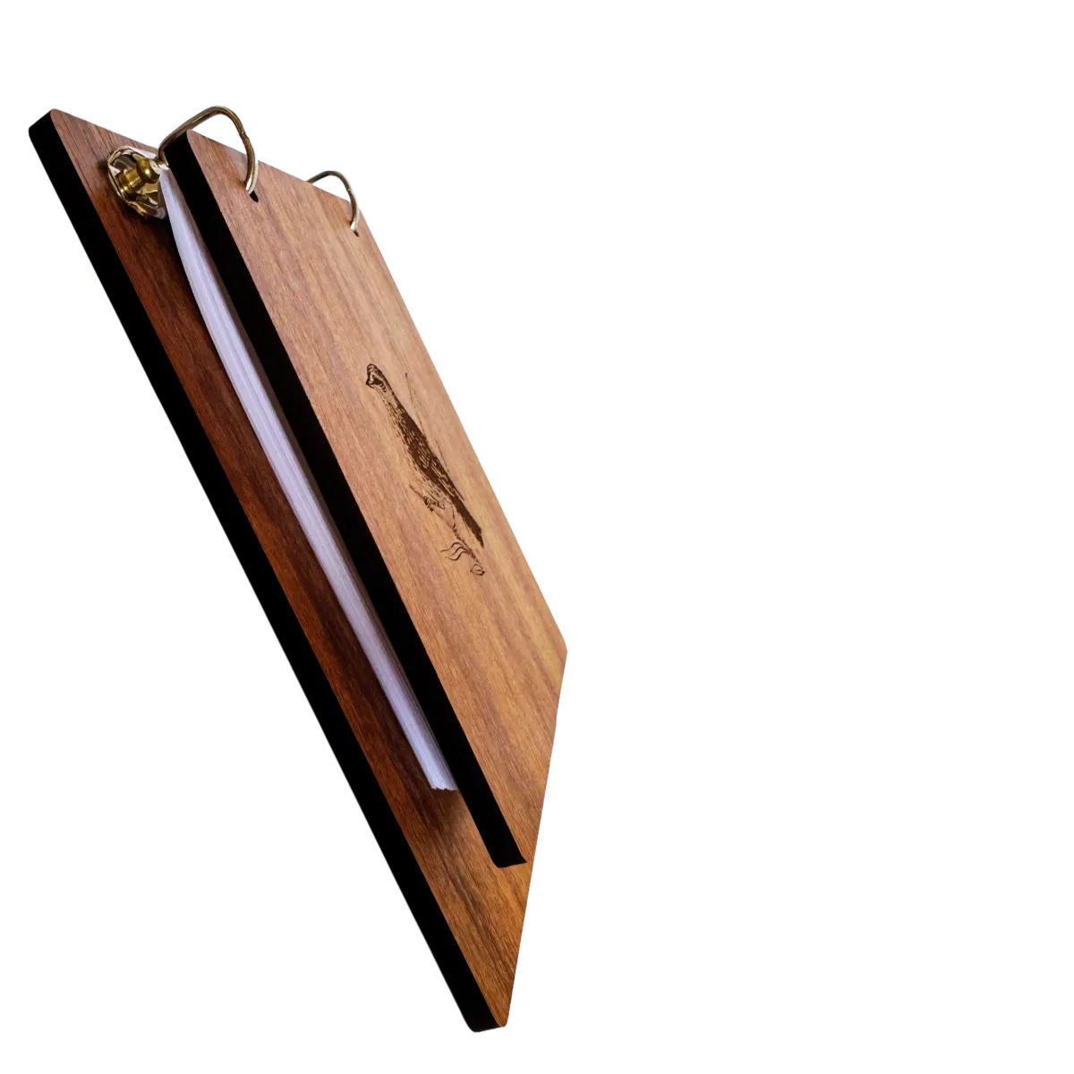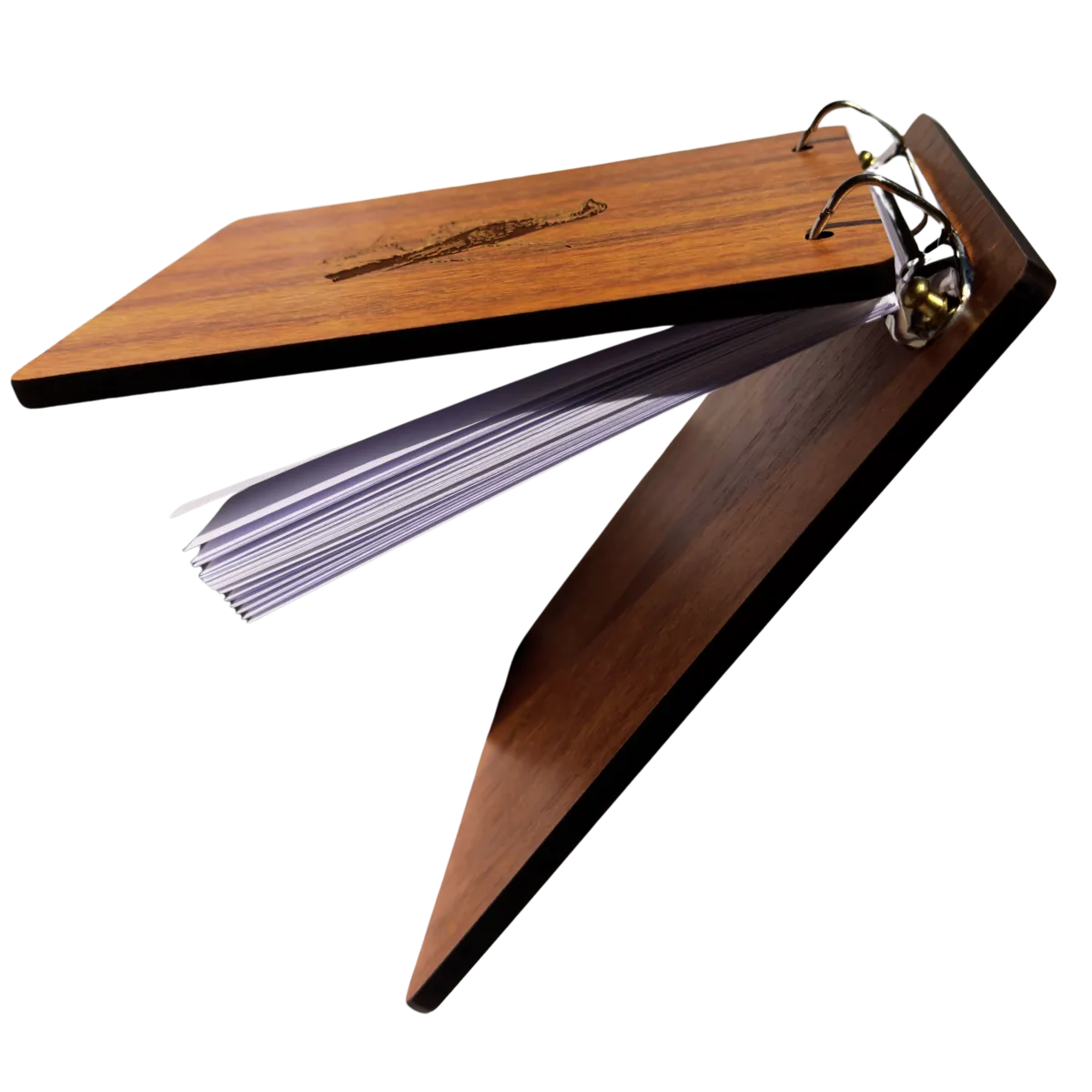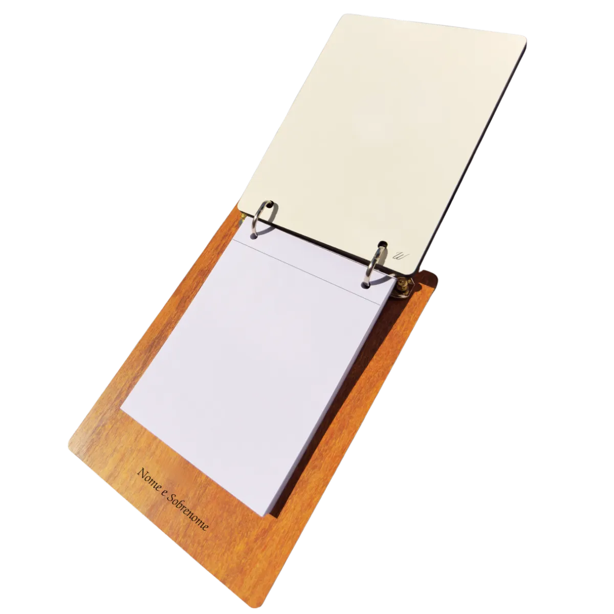 Para manter tudo organizado, utilizamos ilhós com calota, equipados com duas argolas de 16mm níqueladas, cada uma com uma base de 20mm. O distanciamento entre esses ganchos é de 8cm, o que torna a troca de folhas e a personalização do seu Woodly simples e prática.